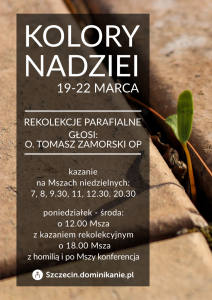 Zapraszamy na rekolekcje parafialne, które w dniach 19-22 marca wygłosi o. Tomasz Zamorski OP z Łodzi według planu przedstawionego na plakacie (i dodatkowo na niedzielnej mszy o 17.15).